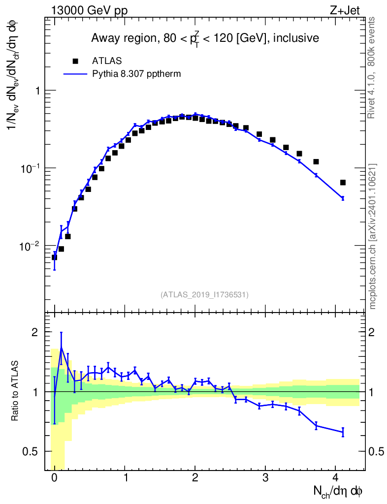 Lines: data, pythia8 8.307 pptherm |
