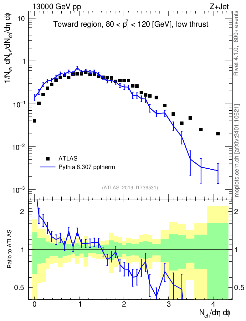 Lines: data, pythia8 8.307 pptherm |