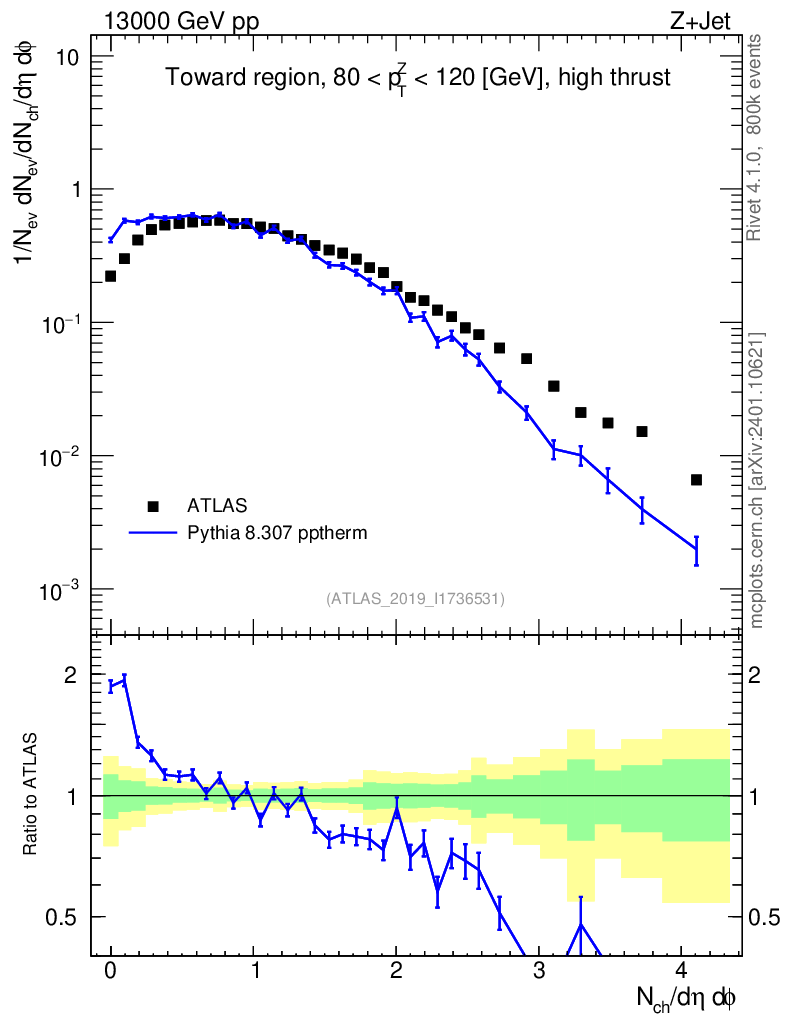 Lines: data, pythia8 8.307 pptherm |