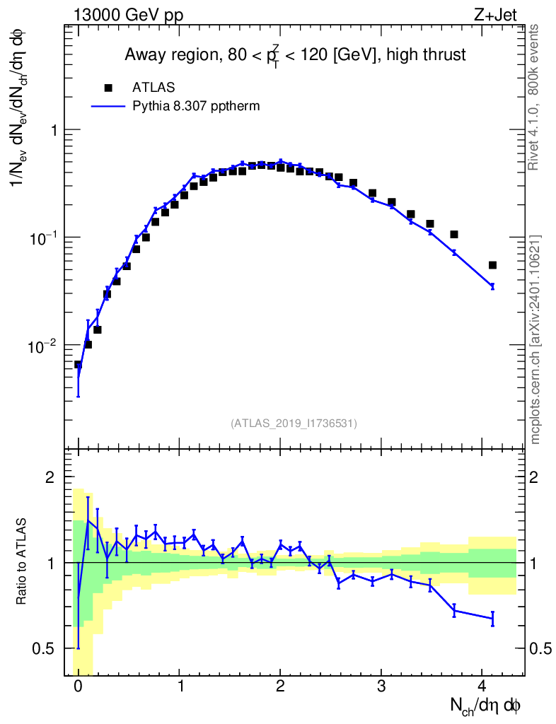 Lines: data, pythia8 8.307 pptherm |