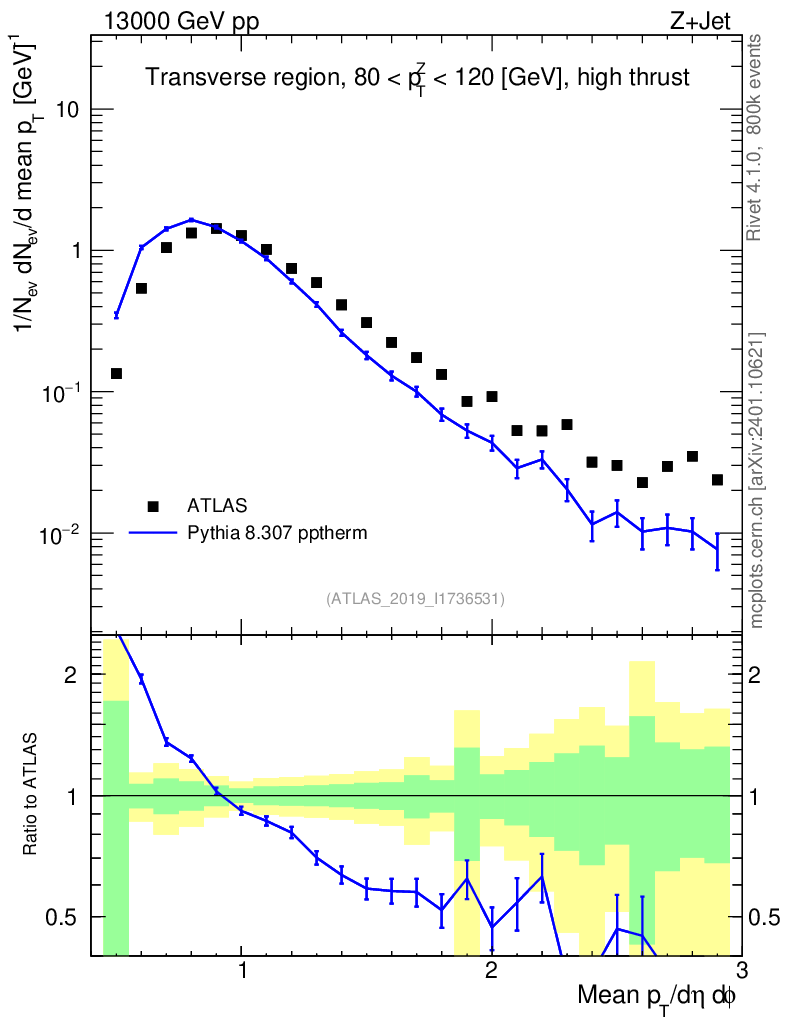 Lines: data, pythia8 8.307 pptherm |