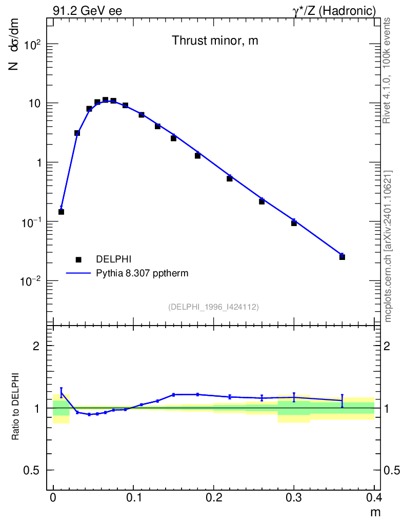 Lines: data, pythia8 8.307 pptherm |