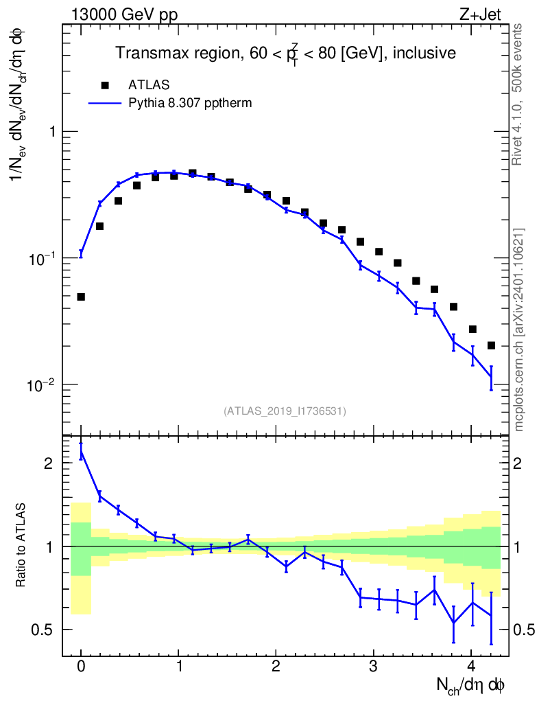 Lines: data, pythia8 8.307 pptherm |