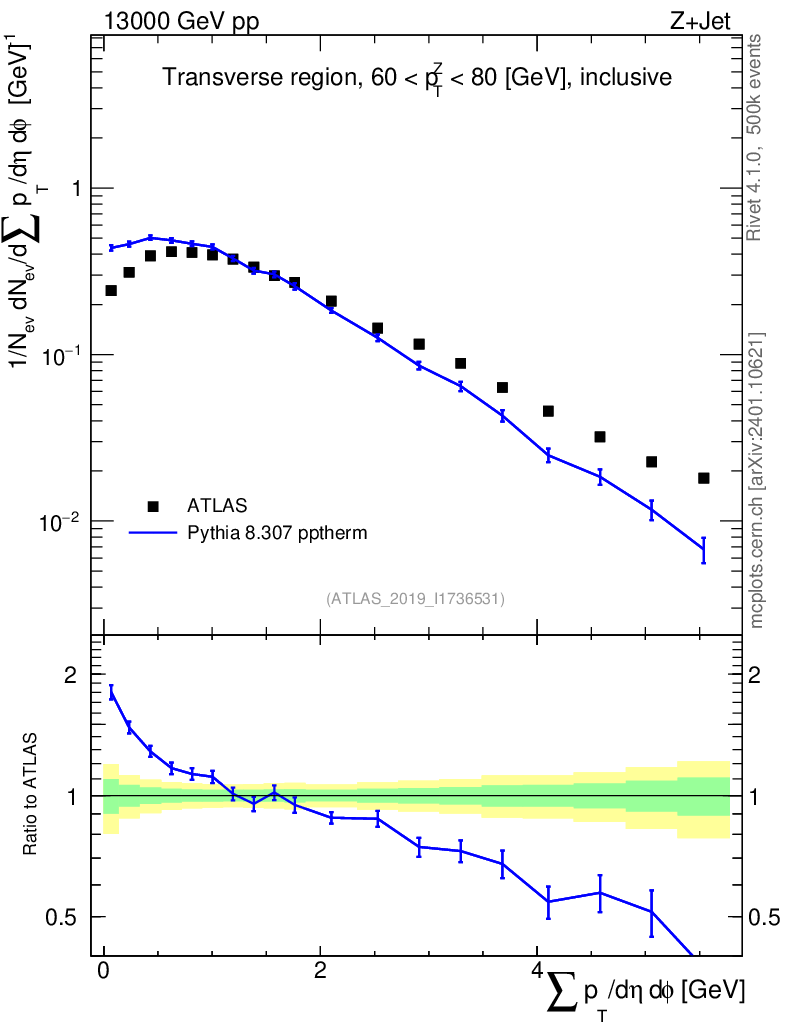 Lines: data, pythia8 8.307 pptherm |