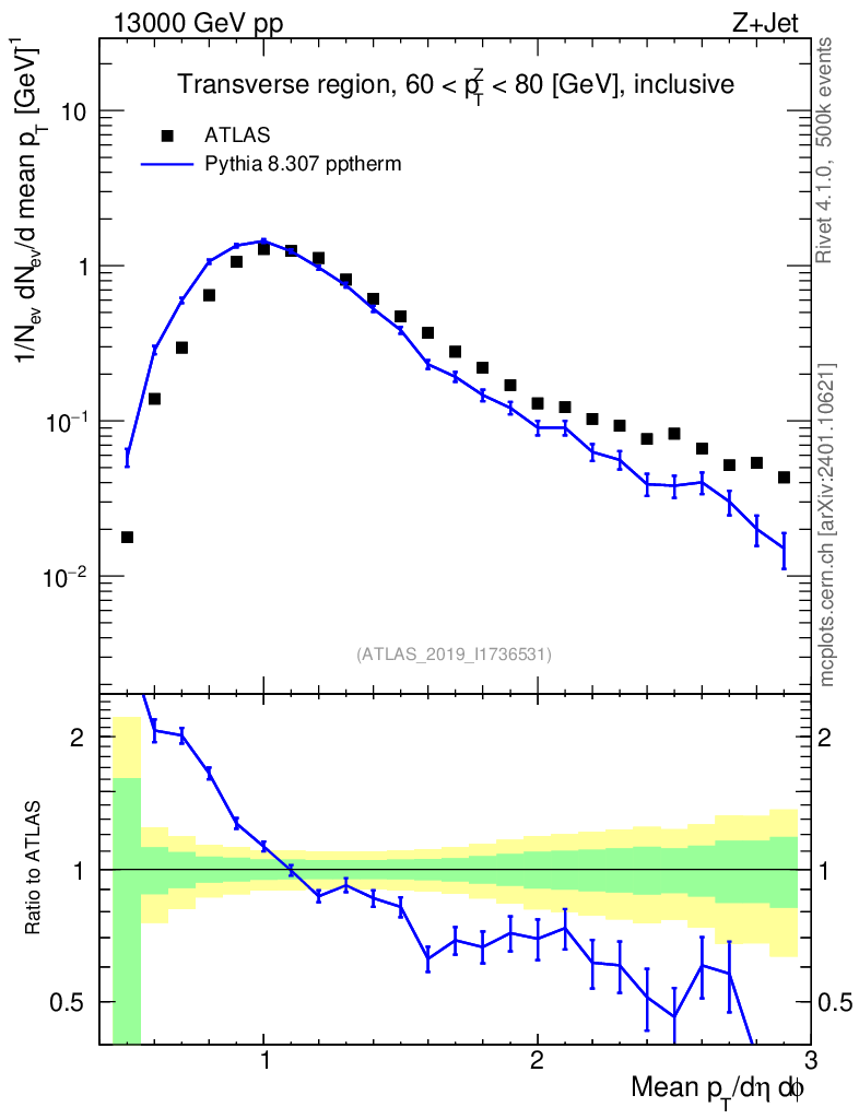 Lines: data, pythia8 8.307 pptherm |