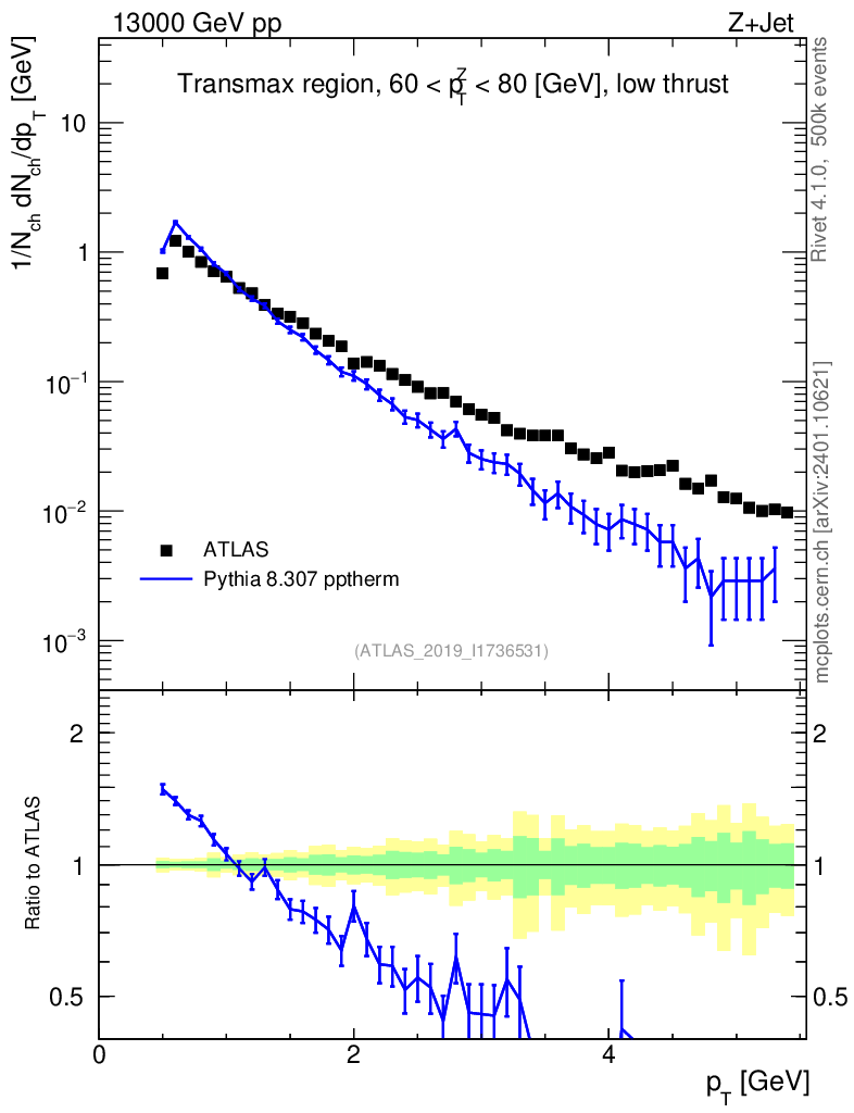 Lines: data, pythia8 8.307 pptherm |