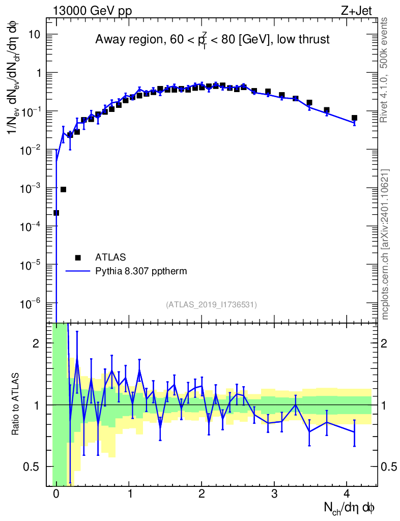 Lines: data, pythia8 8.307 pptherm |