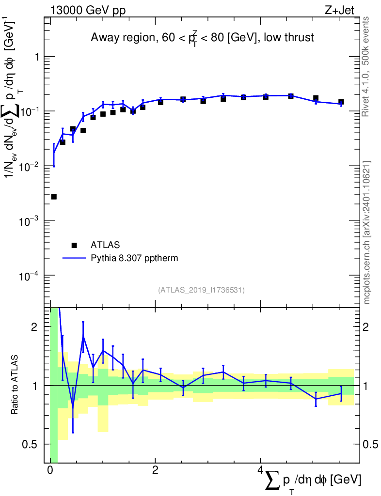 Lines: data, pythia8 8.307 pptherm |