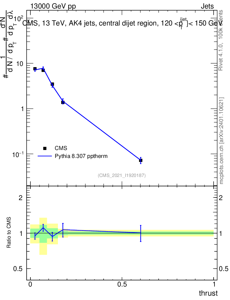 Lines: data, pythia8 8.307 pptherm |