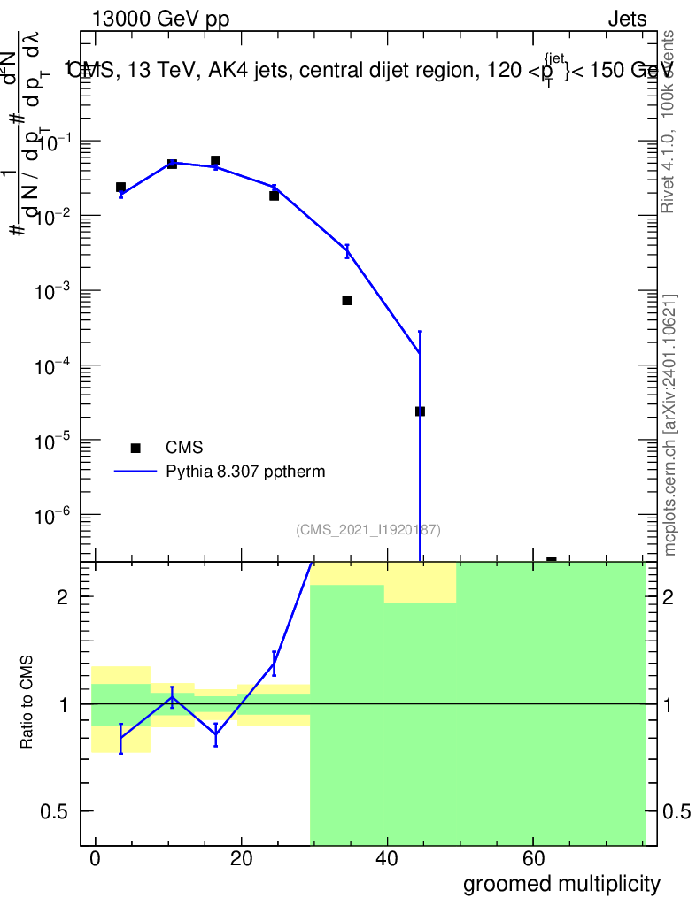 Lines: data, pythia8 8.307 pptherm |