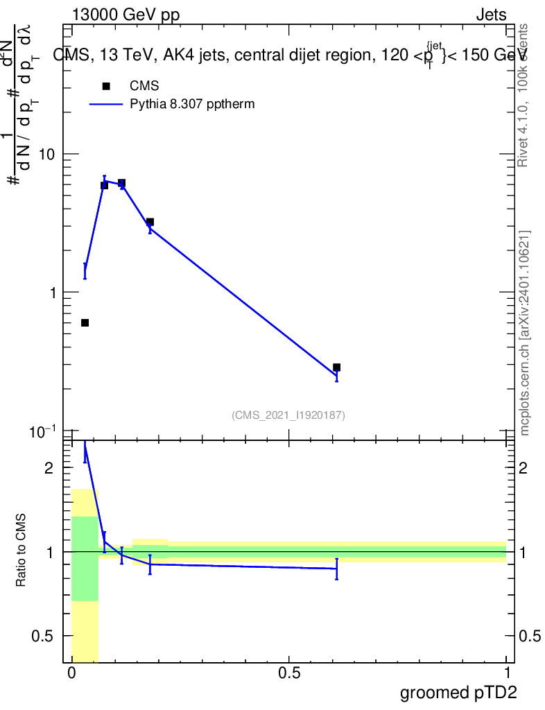 Lines: data, pythia8 8.307 pptherm |