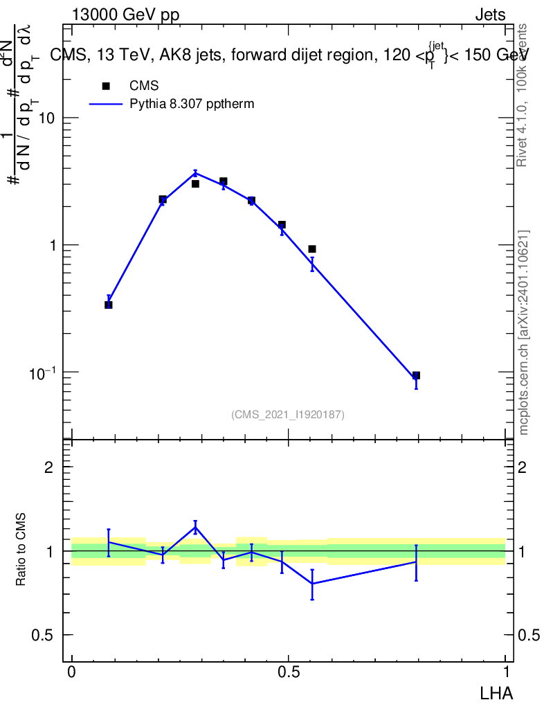 Lines: data, pythia8 8.307 pptherm |