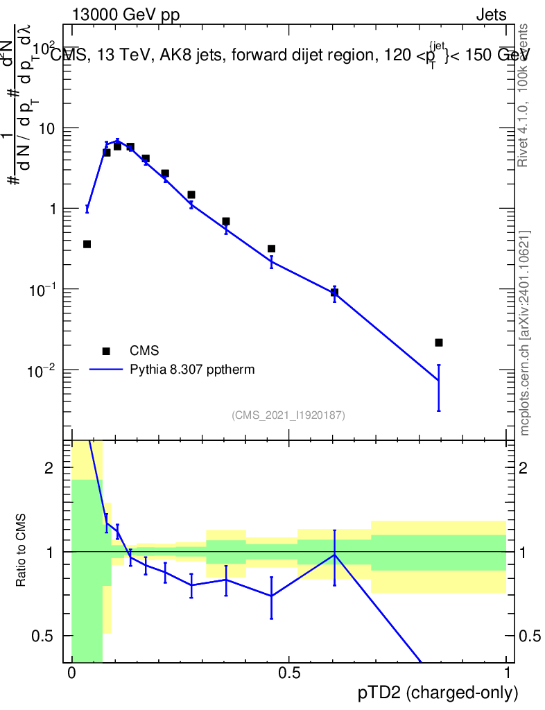 Lines: data, pythia8 8.307 pptherm |