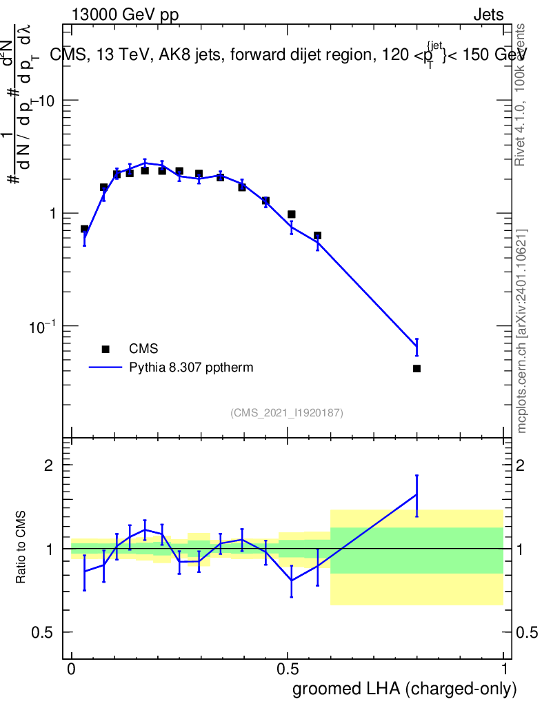 Lines: data, pythia8 8.307 pptherm |