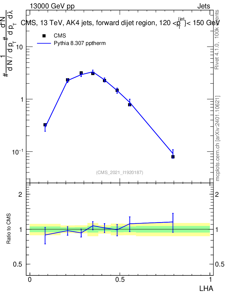 Lines: data, pythia8 8.307 pptherm |