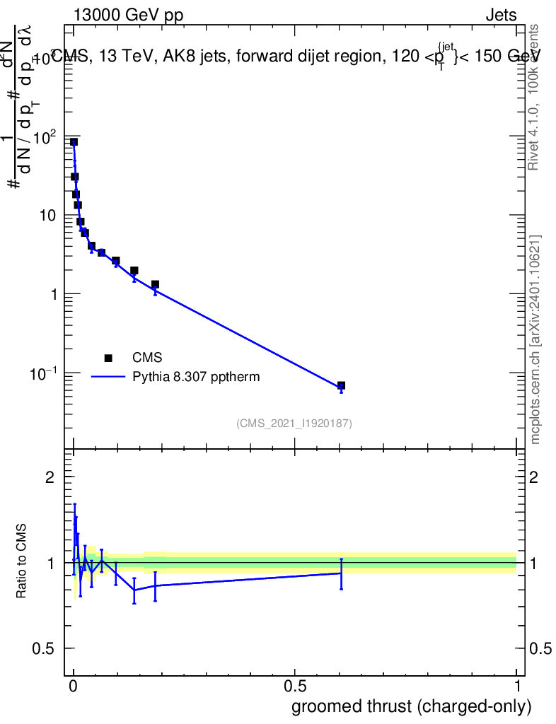 Lines: data, pythia8 8.307 pptherm |