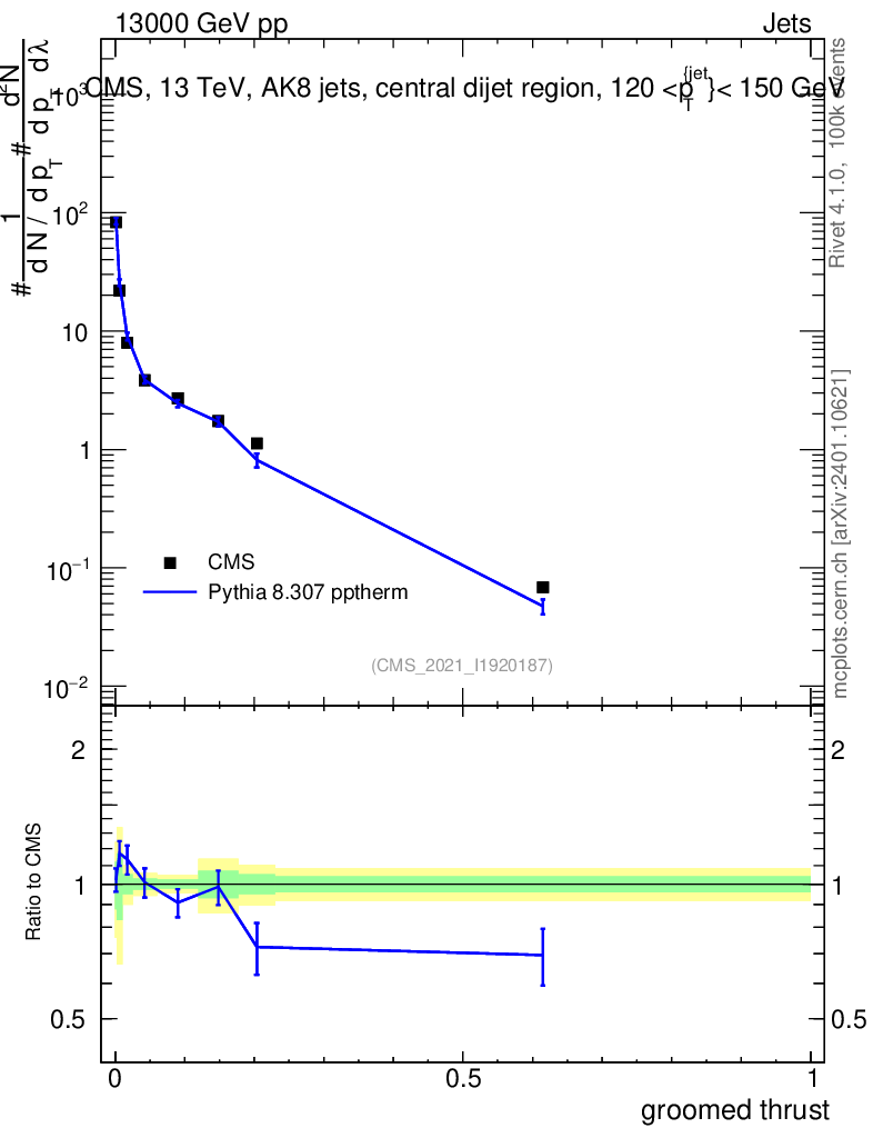 Lines: data, pythia8 8.307 pptherm |