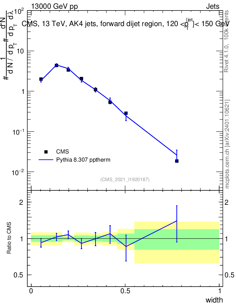 Lines: data, pythia8 8.307 pptherm |