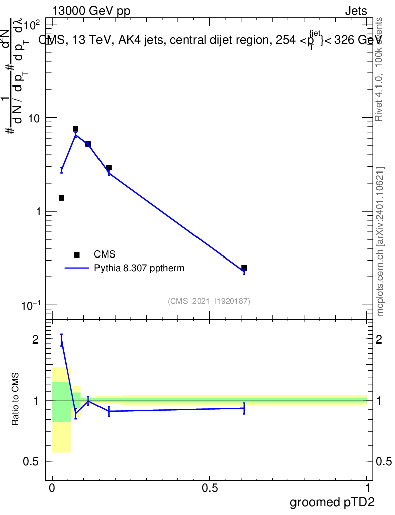 Lines: data, pythia8 8.307 pptherm |