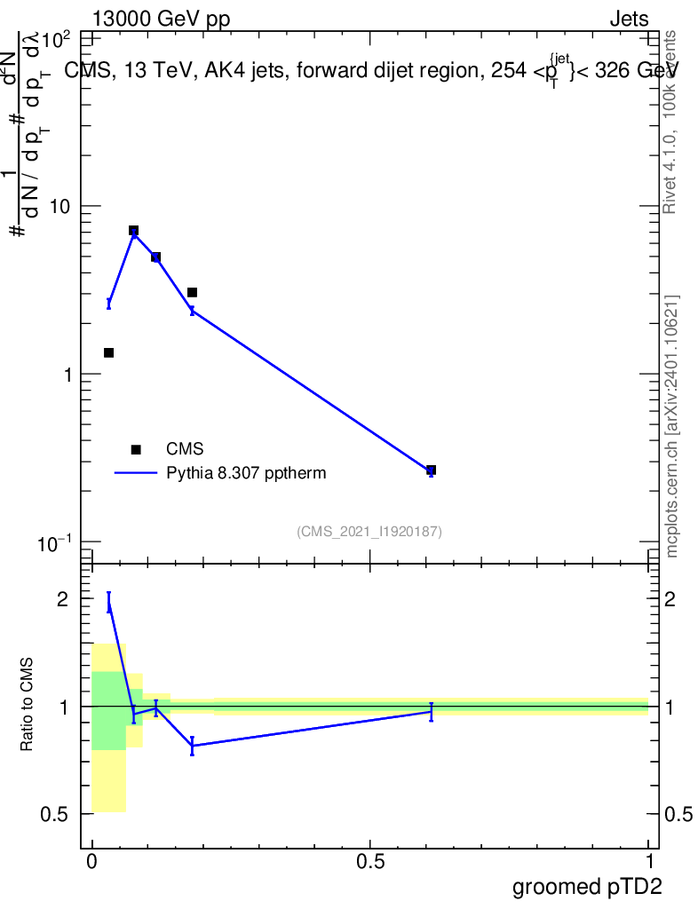 Lines: data, pythia8 8.307 pptherm |