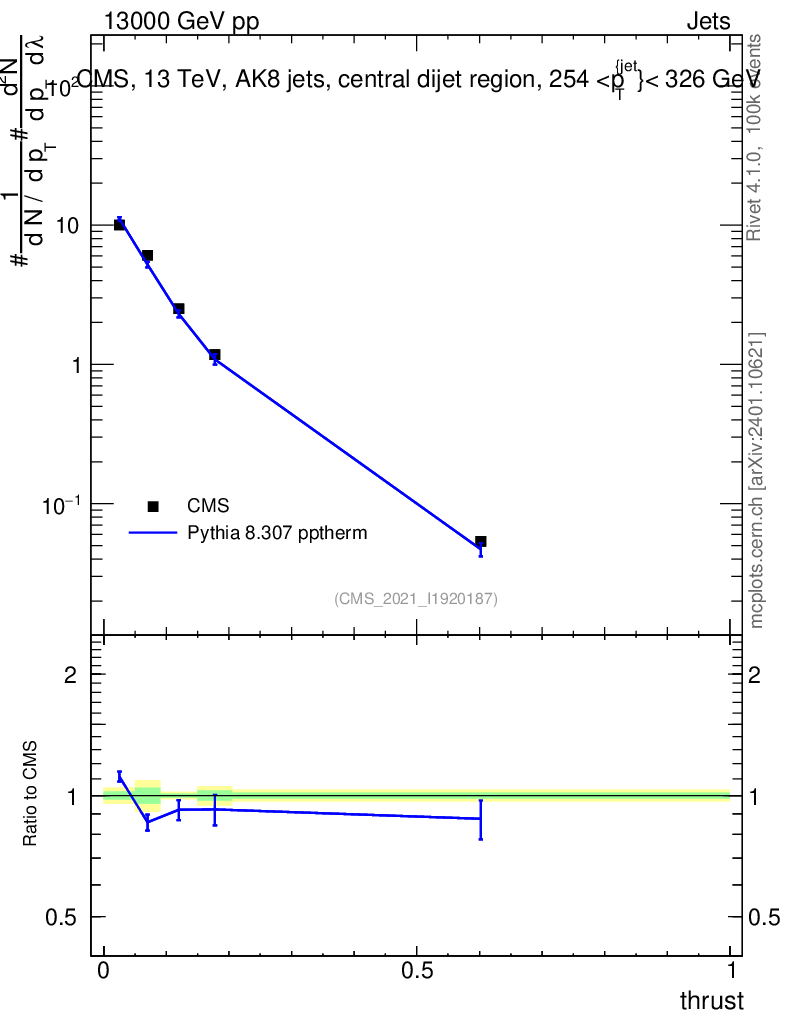 Lines: data, pythia8 8.307 pptherm |