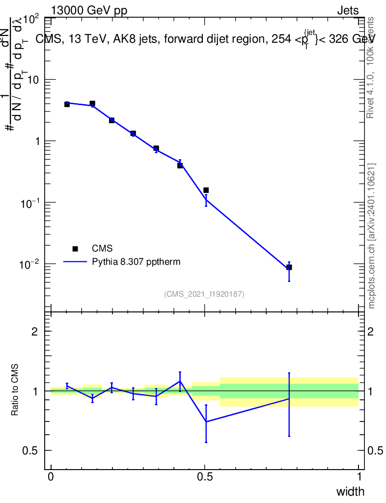 Lines: data, pythia8 8.307 pptherm |