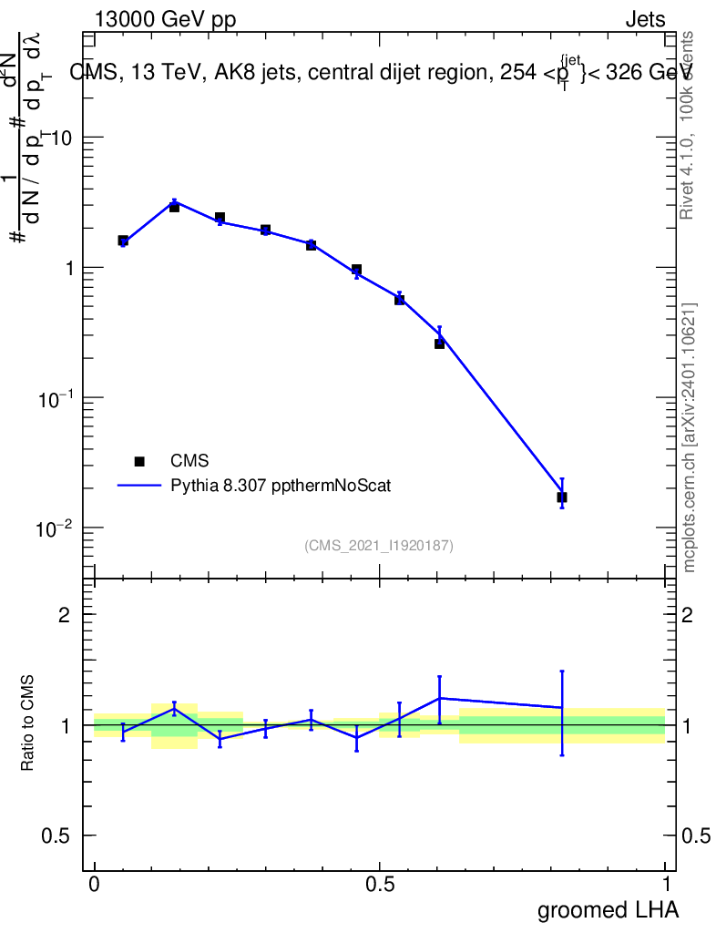 Lines: data, pythia8 8.307 ppthermNoScat |