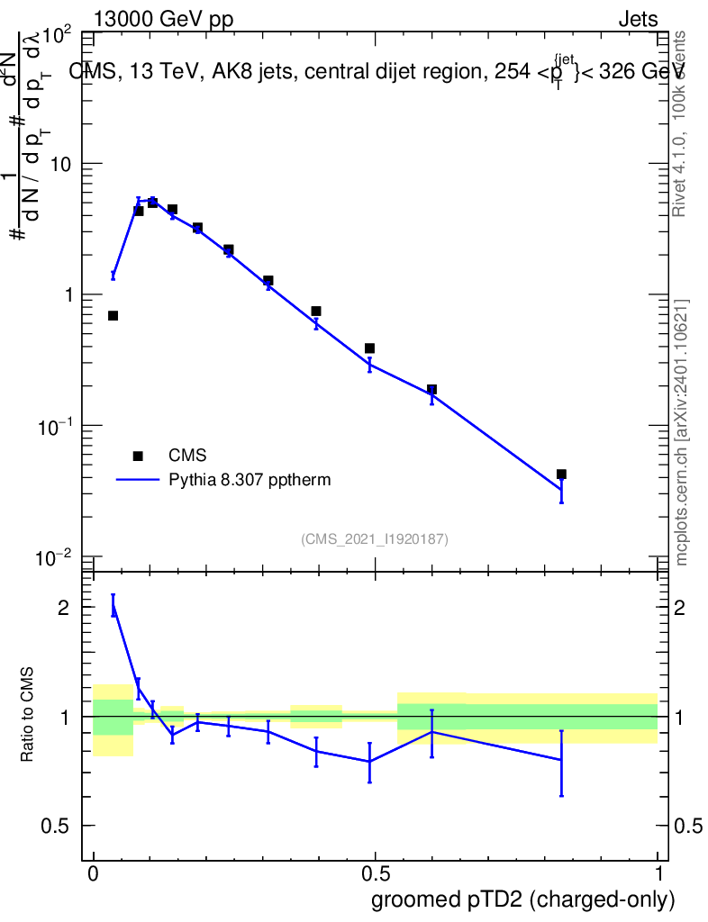 Lines: data, pythia8 8.307 pptherm |