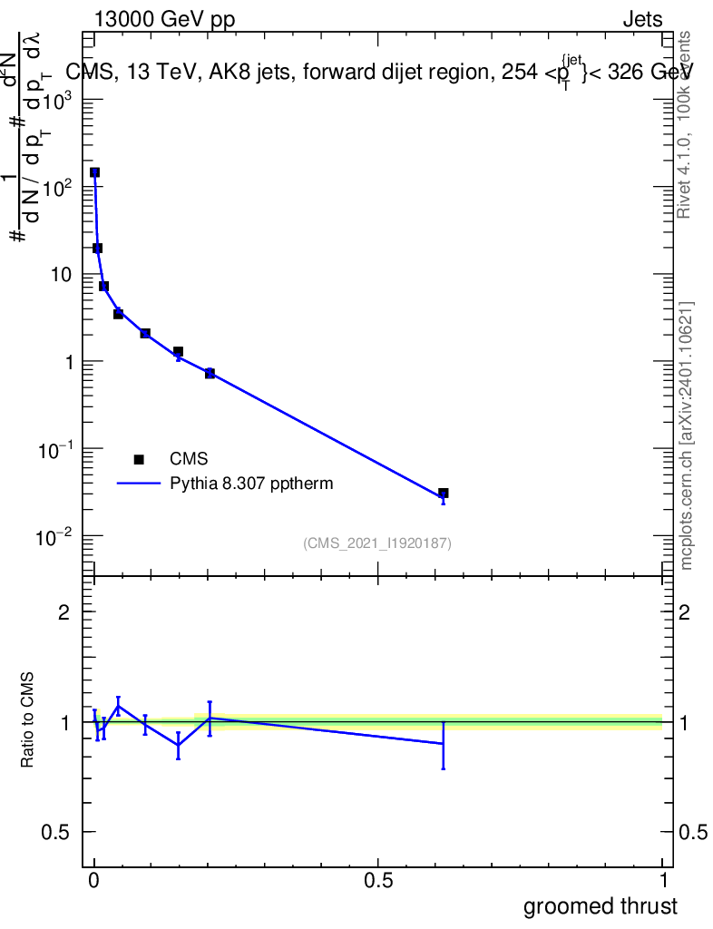 Lines: data, pythia8 8.307 pptherm |