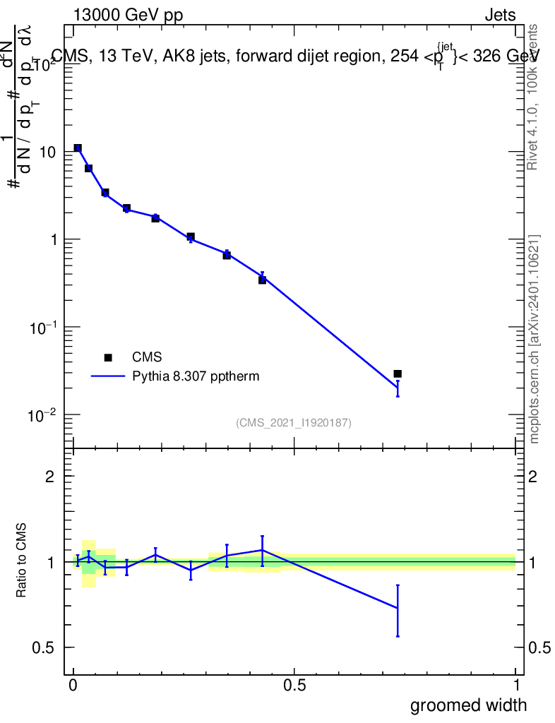 Lines: data, pythia8 8.307 pptherm |