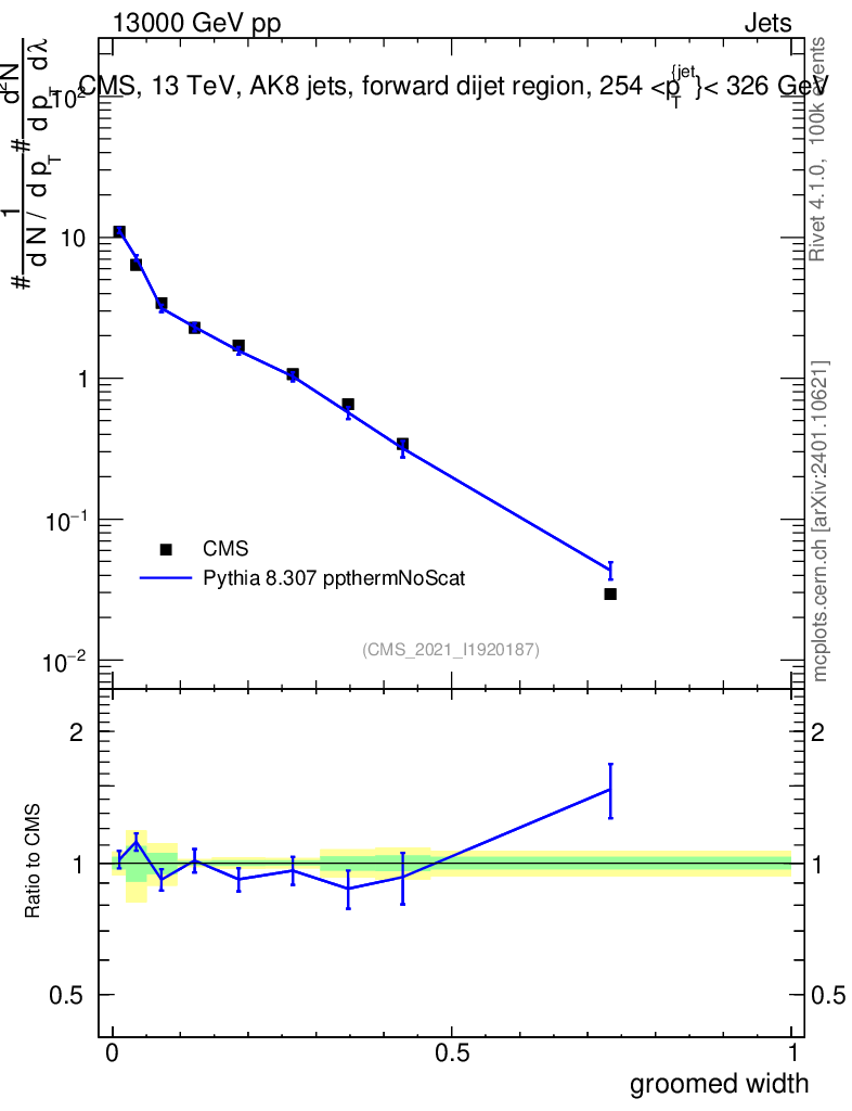 Lines: data, pythia8 8.307 ppthermNoScat |