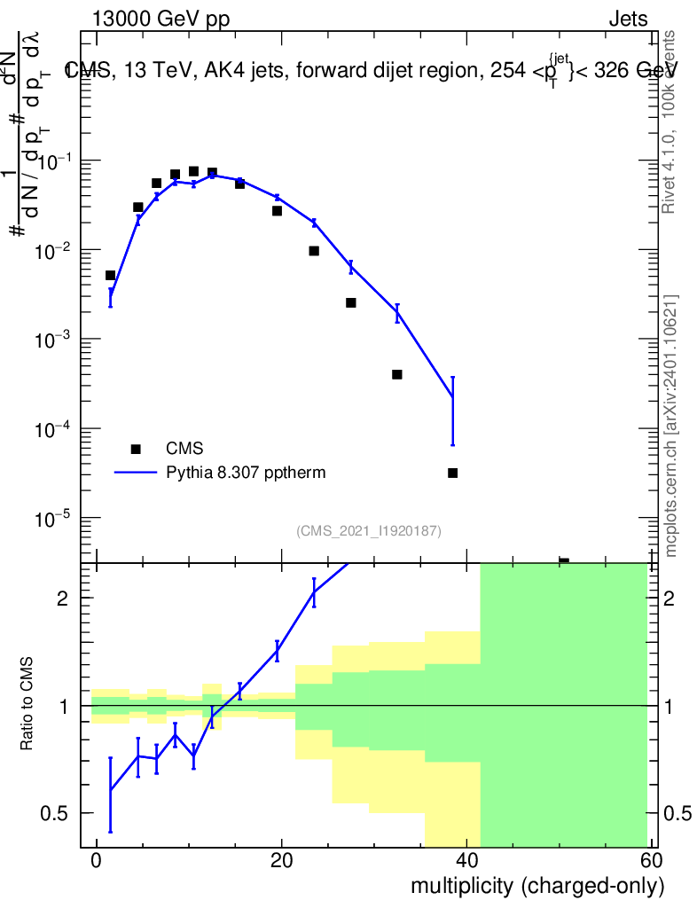 Lines: data, pythia8 8.307 pptherm |