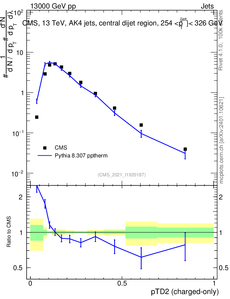 Lines: data, pythia8 8.307 pptherm |