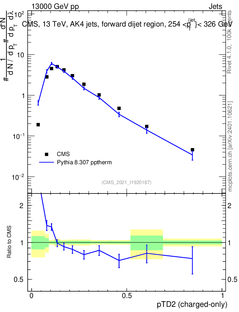 Lines: data, pythia8 8.307 pptherm |