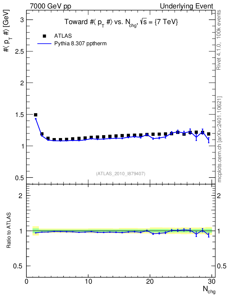Lines: data, pythia8 8.307 pptherm |
