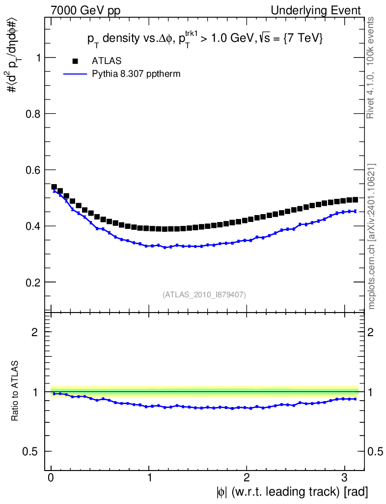 Lines: data, pythia8 8.307 pptherm |