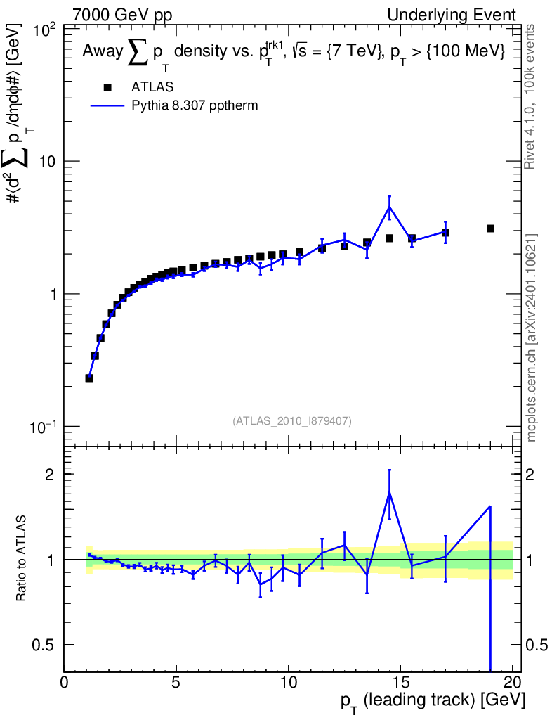 Lines: data, pythia8 8.307 pptherm |