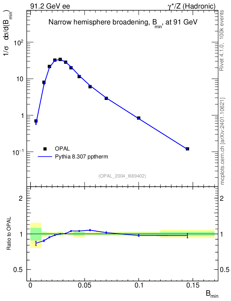 Lines: data, pythia8 8.307 pptherm |