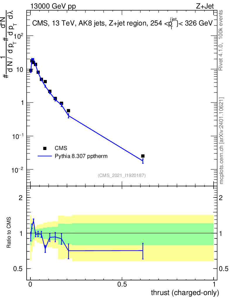 Lines: data, pythia8 8.307 pptherm |
