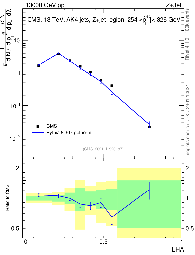 Lines: data, pythia8 8.307 pptherm |