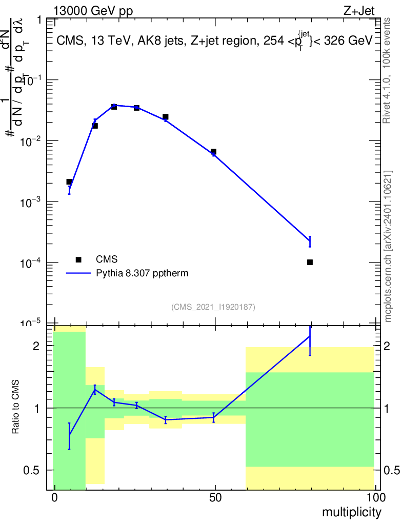Lines: data, pythia8 8.307 pptherm |