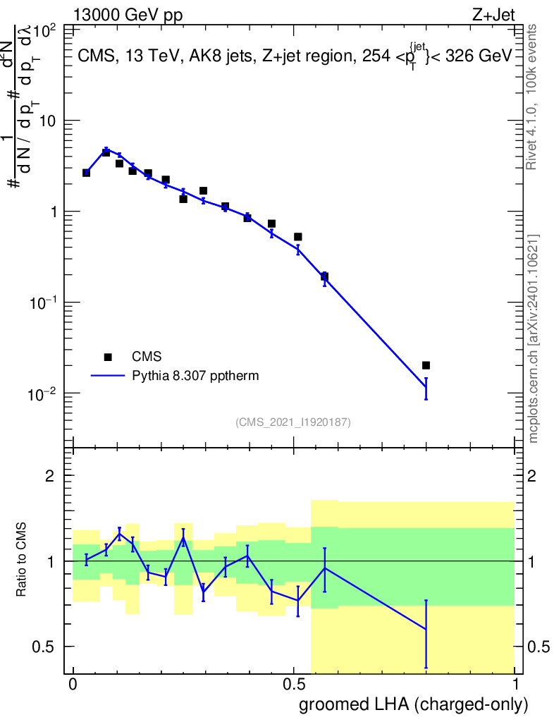 Lines: data, pythia8 8.307 pptherm |