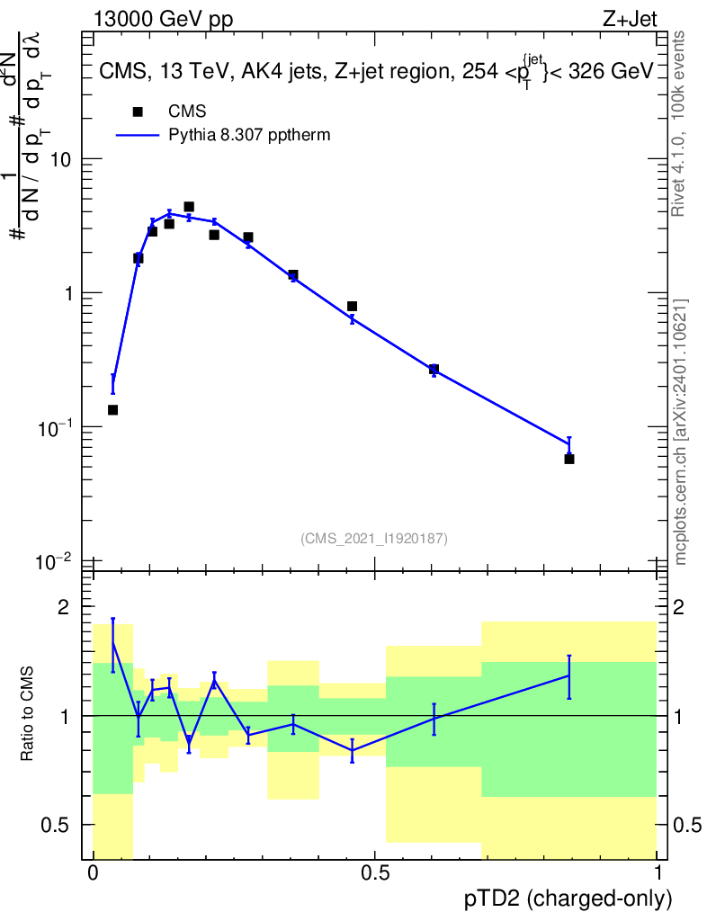 Lines: data, pythia8 8.307 pptherm |