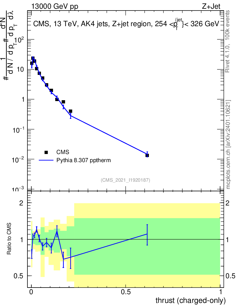 Lines: data, pythia8 8.307 pptherm |
