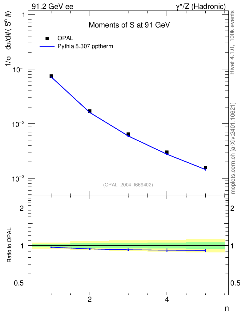 Lines: data, pythia8 8.307 pptherm |