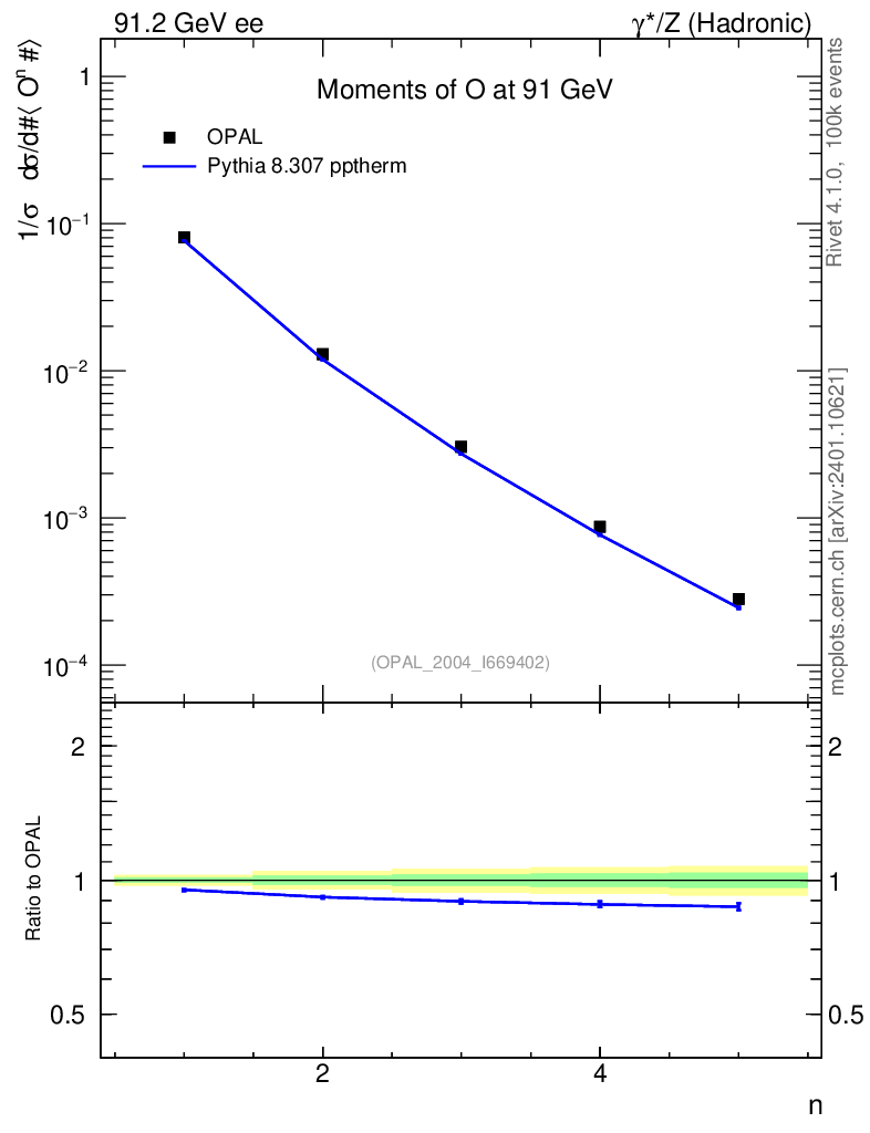 Lines: data, pythia8 8.307 pptherm |