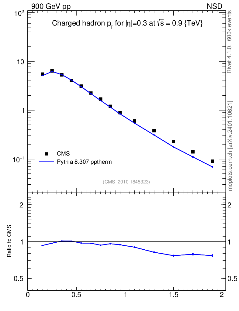 Lines: data, pythia8 8.307 pptherm |