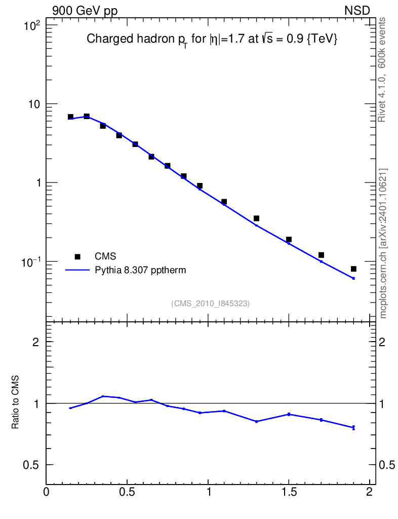 Lines: data, pythia8 8.307 pptherm |