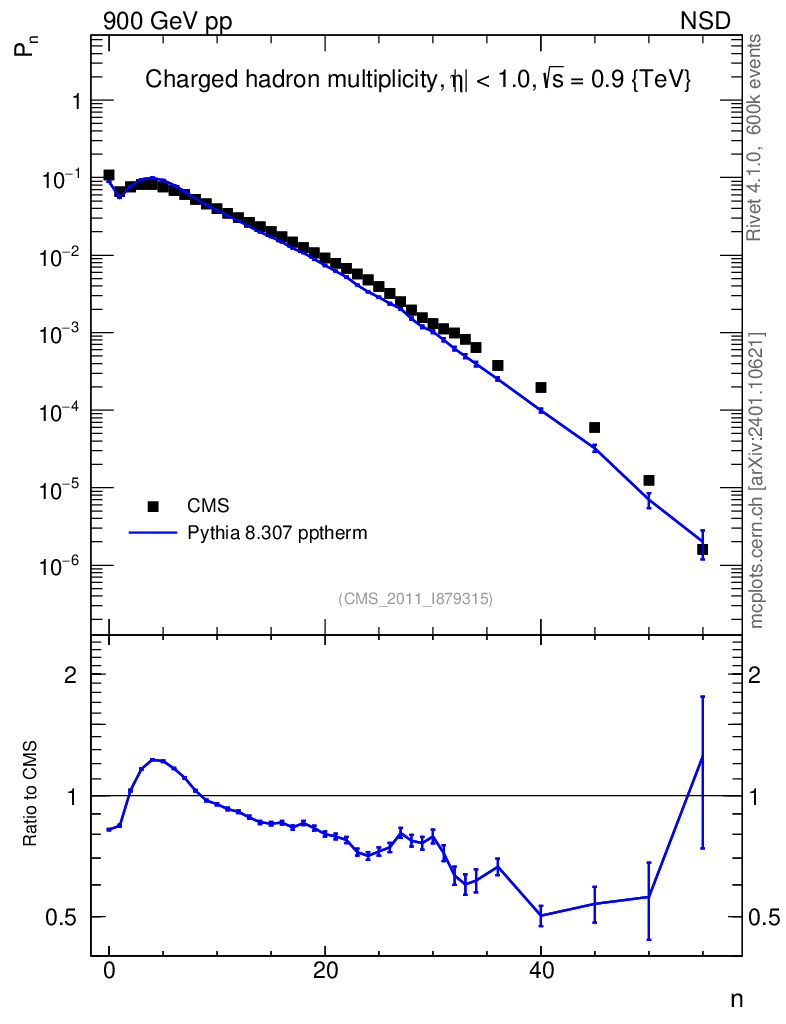 Lines: data, pythia8 8.307 pptherm |