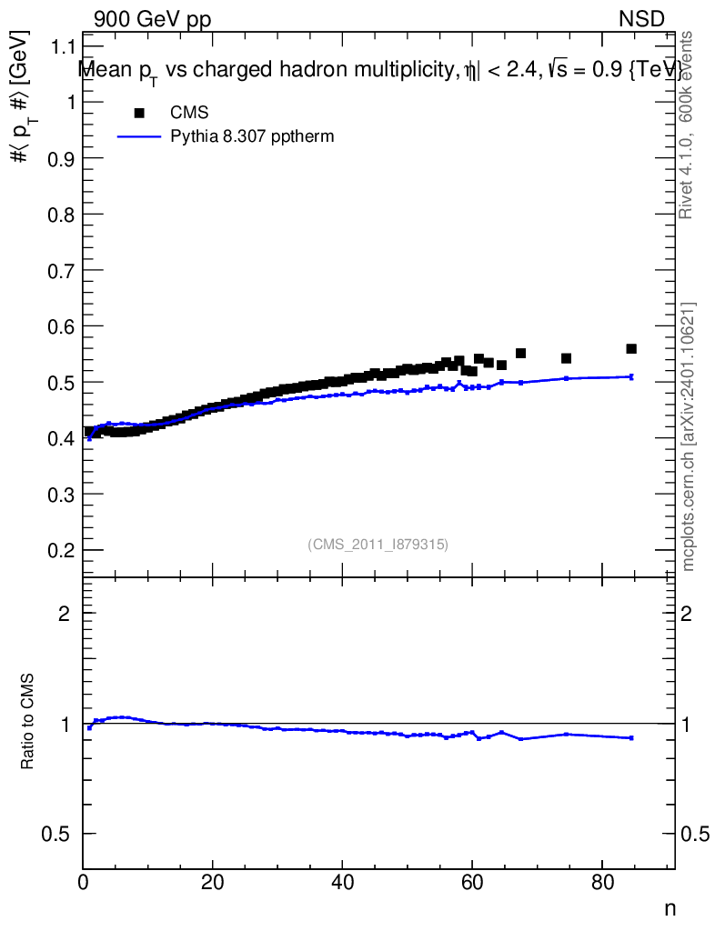 Lines: data, pythia8 8.307 pptherm |